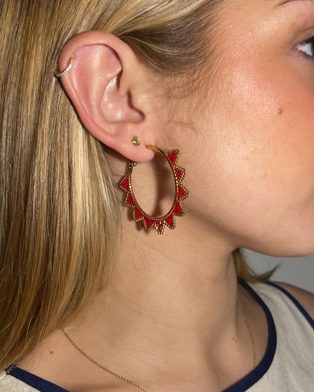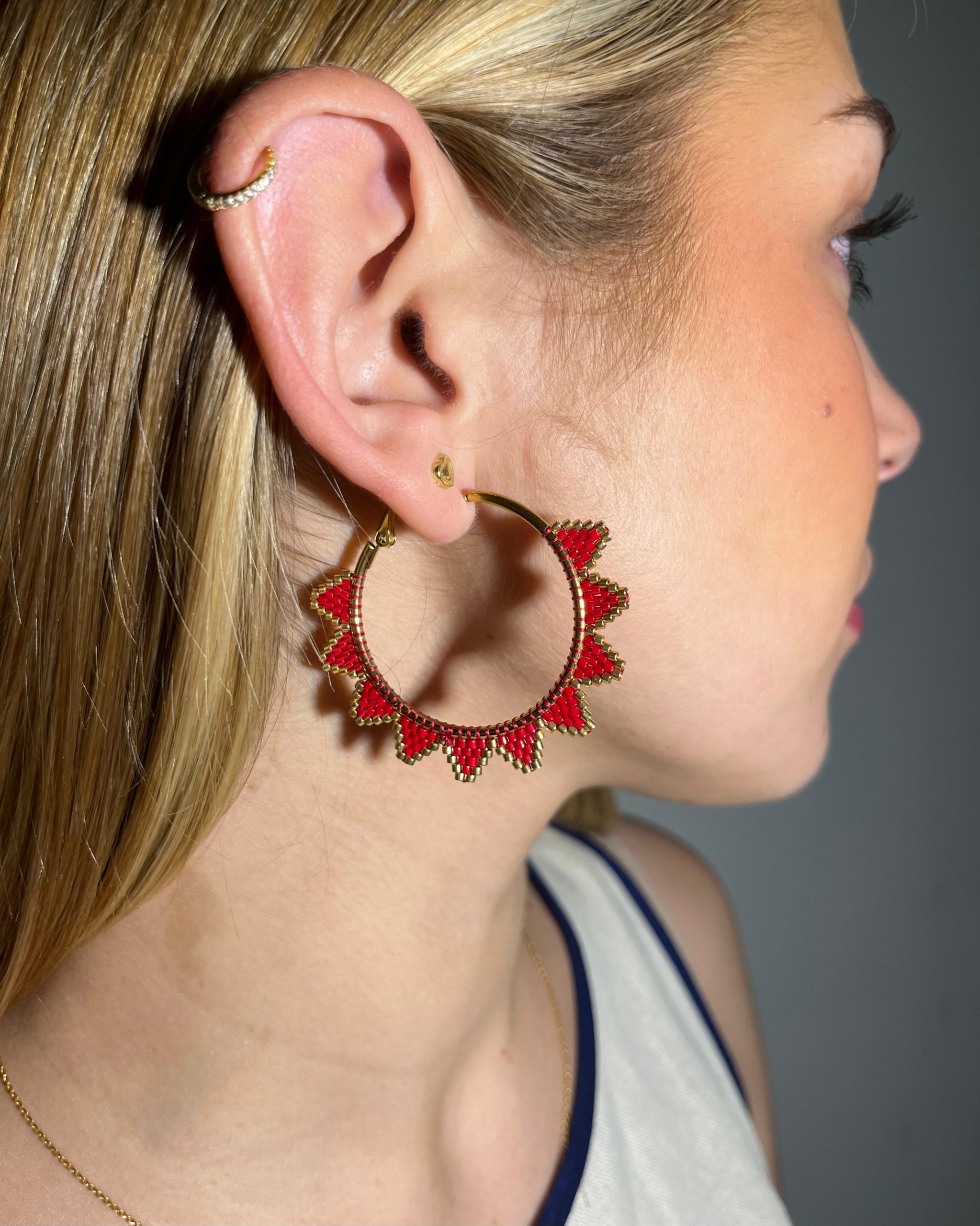 Pendientes Miyuki. Aros de acero dorado con cuentas rojas y doradas.