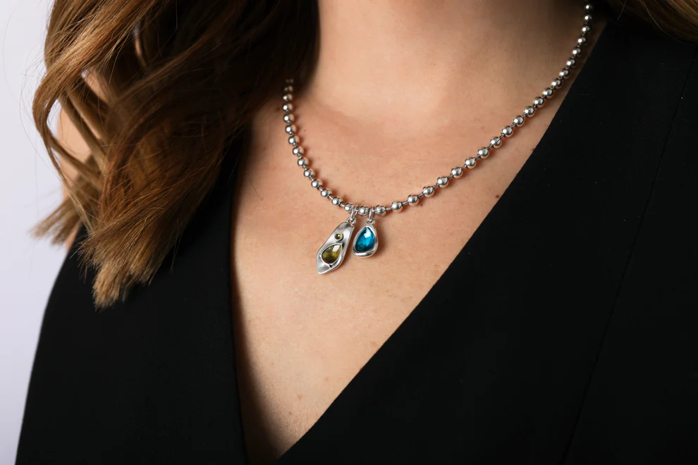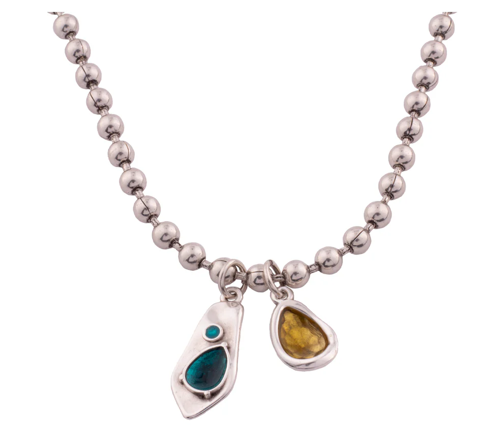 Garantilla Hawái, cadena de bolas bañada en plata de alta calidad. Terminada con mosquetón y cadena para adaptarla a cualquier longitud. Colgando lleva dos piezas irregulares igualmente bañadas en plata y esmaltadas con esmalte al fuego.